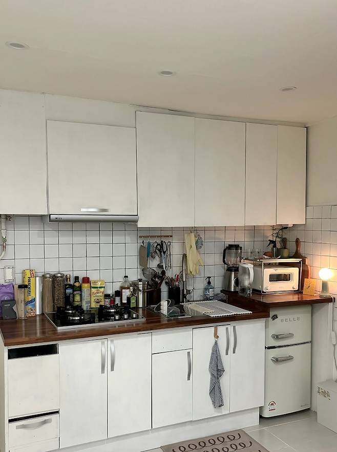 그리고 오른쪽 벨 냉장고 쪽 하부장만 없애서 미니 냉장고를 넣었어요. 냉장고를 두 대 들인 이유는 단순해요. 메인 냉장고를 둘 공간이 없어 거실 쪽으로 배치한 만큼 요리할 때 재료 꺼내기가 불편할 것 같았거든요. 미니 냉장고 높이가 기존 상판 높이를 넘어버려 원목으로 맞출 때 재단을 해서 맞춰 넣었어요.