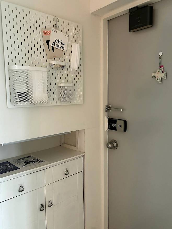 각종 공구와 신발을 가득 넣은 신발장과 택배용 칼, 마스크 등을 수납하기 위한 이케아 타공판을 설치했어요. 현관에는 올 초 친구가 선물해 준 새 인형과 청룡의 해를 상징하는 연하장, 그리고 최근 Achim(아침)의 모닝 오너가 되며 받은 카드를 함께 두었습니다.