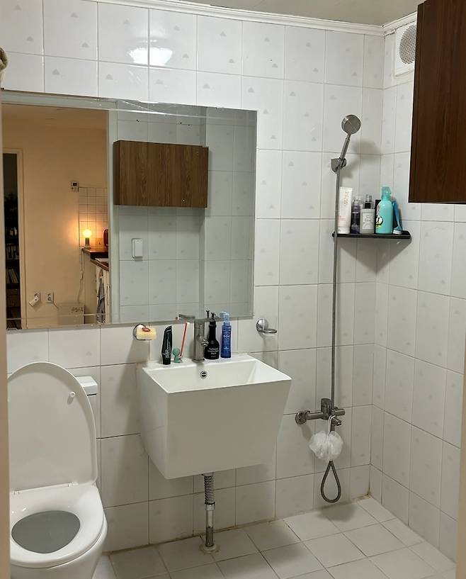 완성된 욕실 사진입니다. 새로 리모델링 하는 것만큼 깔끔하진 않아도 생각보다 괜찮죠? 샤워 공간이 넓고, 거울도 크다는 게 장점이에요.