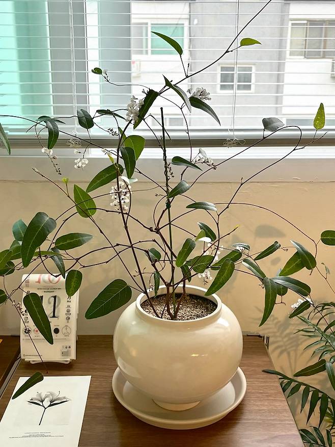 요즘은 식물이 조금씩 늘고 있어요. 원래 본가에서 받아온 식물이 대부분이었는데, 최근 흰싸리나무를 들였습니다. 싸리나무는 겨울에서 봄까지 꽃을 피우는 식물이에요. 수형이 매력적이고 햇빛을 좋아해 채광이 가장 좋은 자리에 두었습니다.