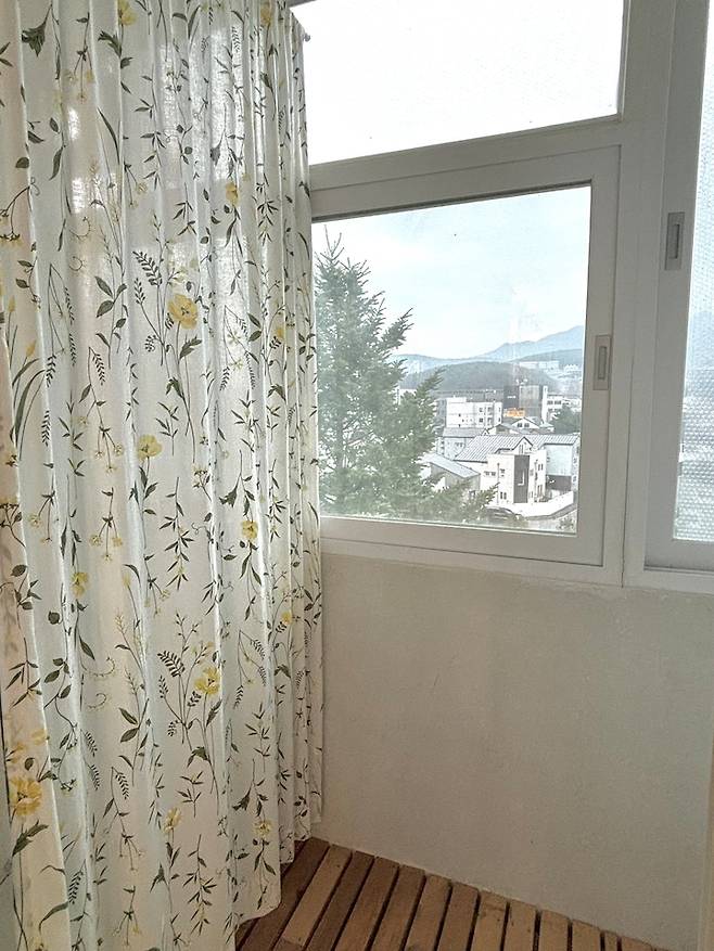 아예 통창으로 만들긴 어려우니 하단 부분만 열고 닫기가 가능하게끔 환기 문제도 해결해 주었고요. 이 집의 숨은 맛집이 베란다 뷰인데, 조금이라도 더 보이게 만들고 싶었거든요.