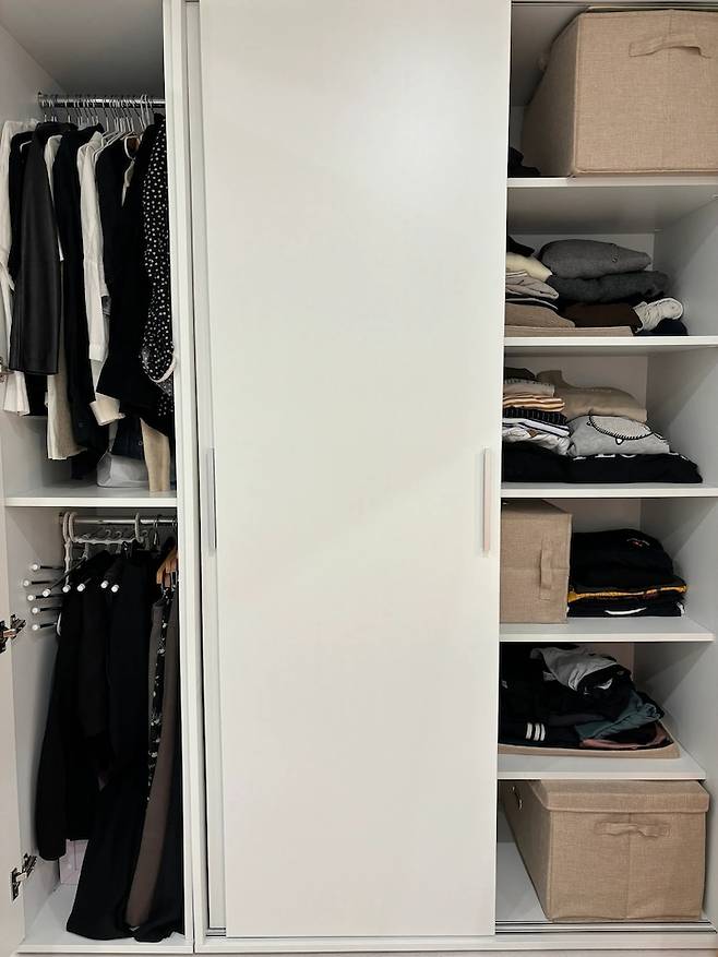 어떤 느낌인지 감이 오시나요? 가운데 닫혀 있는 부분은 원피스나 아우터 등 긴 옷을 걸어두고 있어요. 수납이 적진 않은데 그렇다고 넉넉한 것도 아니라 옷 가짓수를 조절하려고 항상 노력하고 있습니다.