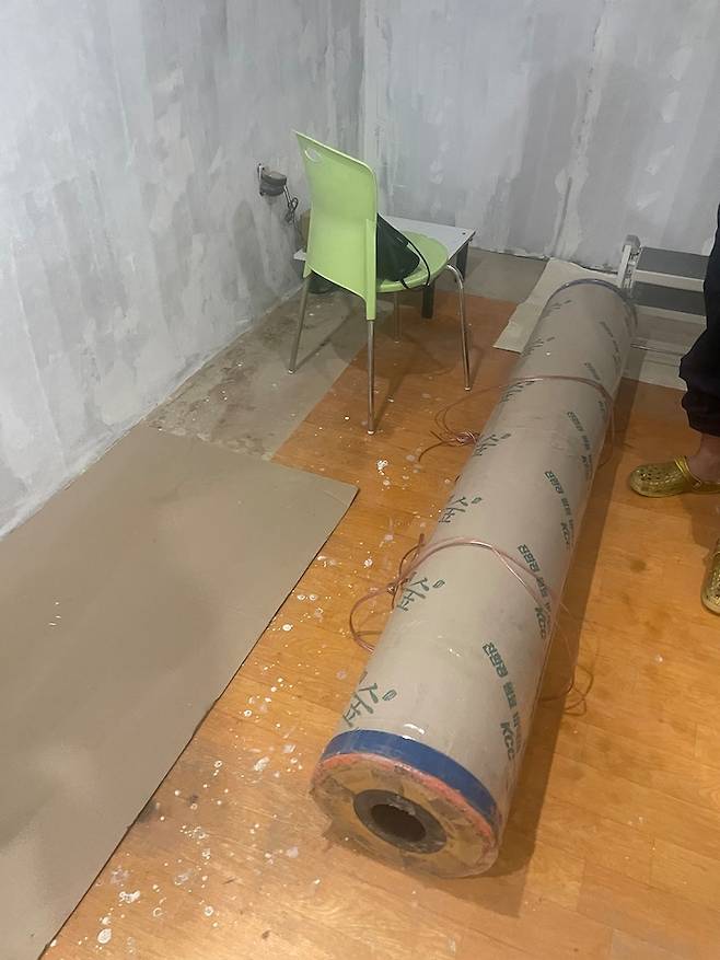 고민 끝에 장판으로 합리적인 결정을 내렸어요. 다만 두께가 있는 장판을 깔아 푹신하면서도 탄탄한 느낌을 연출하고 싶었어요. 하지만 문제가 터져버리고 맙니다. 이 장판 역시 가족들과 함께 깐다고 4층까지 들고 날라서 시공했는데 대차게 망해버린 거예요.