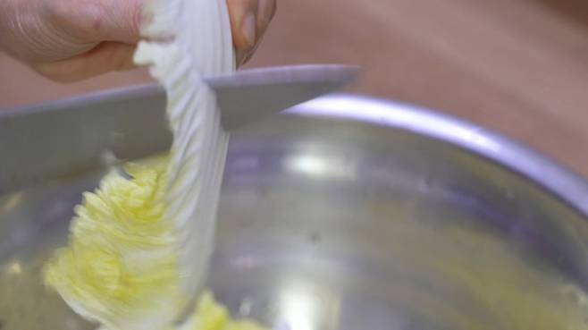 물 빠진 배추를 서로 버무려 주세요.