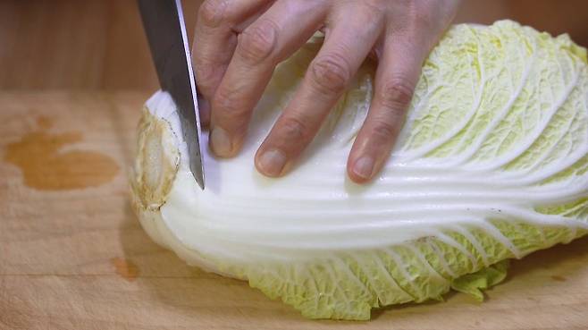 먼저 배추 밑동을 잘라 주세요.