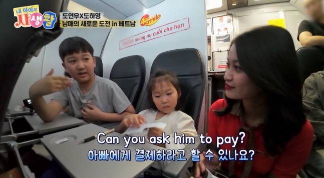 음식을 시킨 건 좋았지만, 문제는 결제였다. 승무원이 따로 비용을 안내하자 연우는 당황하지 않고 영어로 아빠의 좌석 번호를 알려주며 말했다.