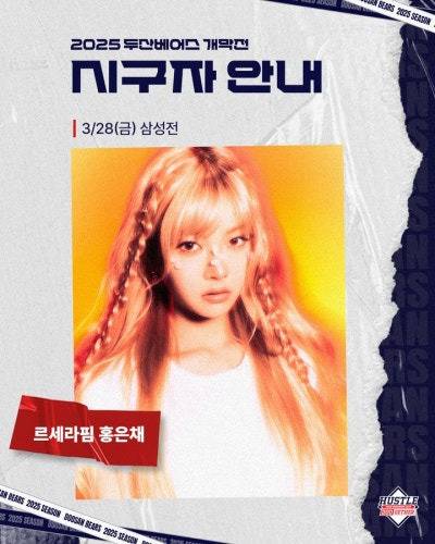 2022년에는 르세라핌 멤버 채원 님과 함께 두산베어스 시구와 시타를 맡아 승리 요정으로 등극하기도 했습니다. 23년에도 시구를 준비했지만 우천 취소되어 아쉬움을 감추지 못하며 팬 소통 앱에 “두산 사랑해요 응원해요 또 시구 불러줘요”라는 글을 남기기도 했습니다. 휴식 기간에도 야구장을 직접 찾아 관람하는 모습이 포착될 정도로 두산베어스에 대한 진심을 드러냈습니다.