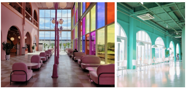 카페 내부는 층마다 다른 시그니처 컬러로 꾸며져 있어 독특한 분위기를 자아냅니다. 1층은 오렌지 컬러, 2층은 블루, 3층은 초록빛으로 꾸며져 있어 마치 색다른 세계에 들어온 것 같은 느낌을 받게 합니다. 연인과 함께 층마다 다른 매력을 느끼며 다양한 사진을 찍으며 추억을 쌓기 좋습니다.