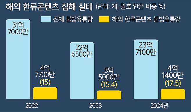 23일 한국저작권보호원의 ‘해외 한류콘텐츠 침해 실태조사’에 따르면 지난해 한국 콘텐츠 불법유통량은 4억1400만개에 달한다. 전체 해외 불법 콘텐츠 유통 사이트 게시물 중 한국 콘텐츠가 차지하는 비중도 2022년 15%에서 2023년 15.4%, 지난해 17.5%로 증가 추세다.