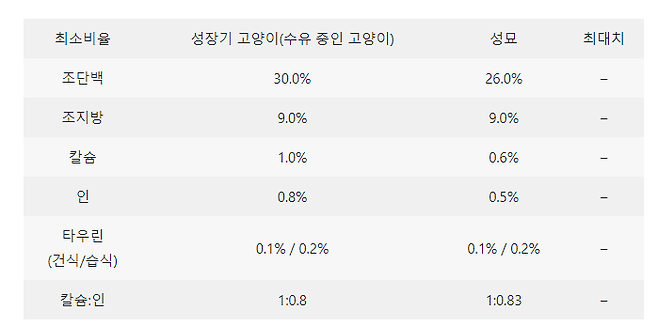 <AAFCO 제시 고양이 영양소 최소 기준(2020)>