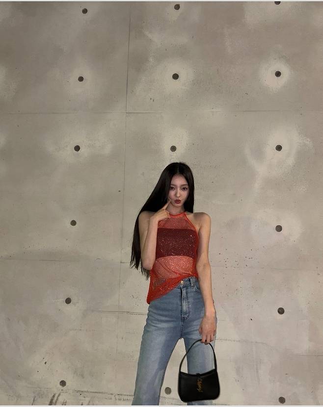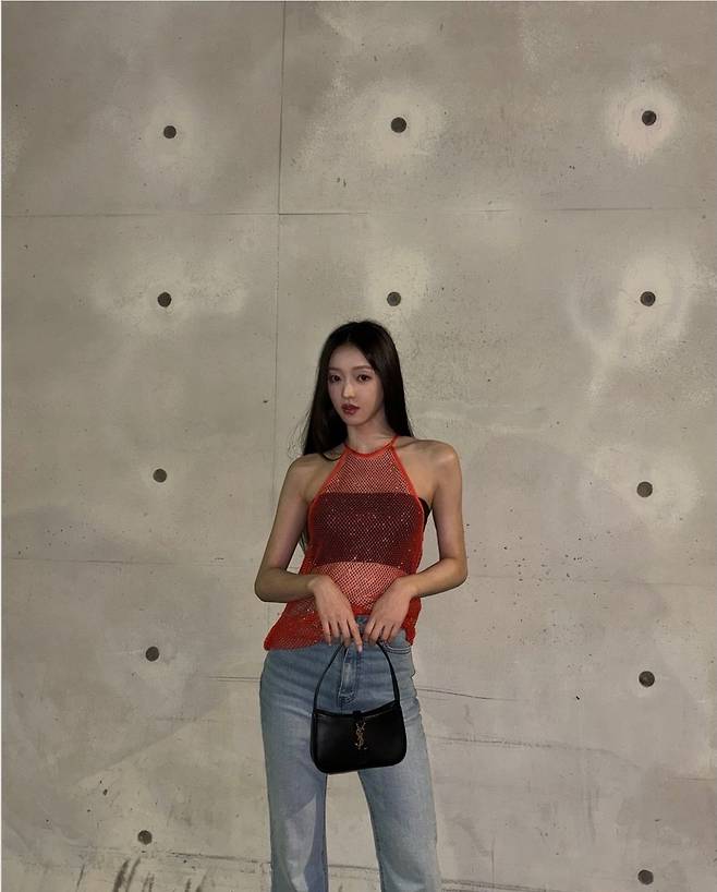 유아는 반짝이는 메쉬 소재의 오렌지 컬러 홀터넥 톱을 착용해 독특한 패션 아이템으로 개성을 드러냈습니다.