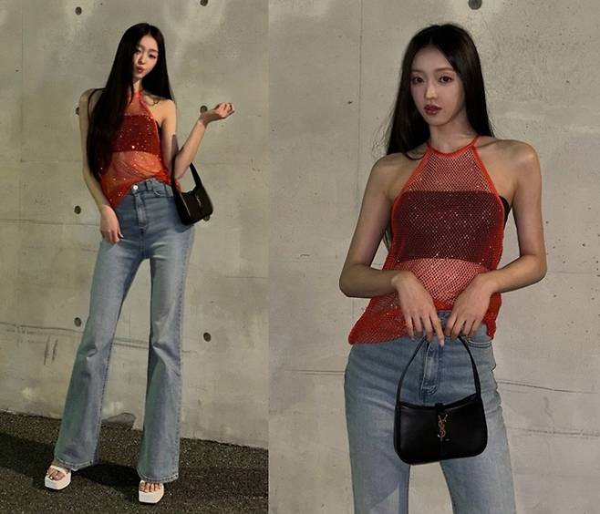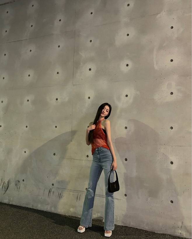 또 유아는 클래식한 블루 데님 팬츠를 매치해 스타일리시한 분위기를 자아냈습니다.