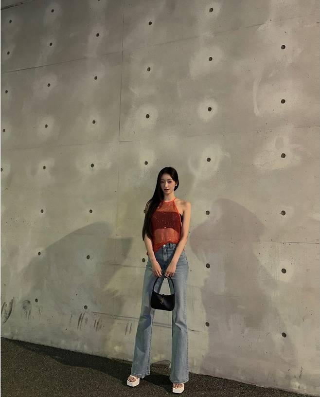 특히 유아는 작은 블랙 핸드백을 활용하여 포인트를 주었으며 화이트 샌들을 착용해 세련된 여름 패션을 완성했습니다.