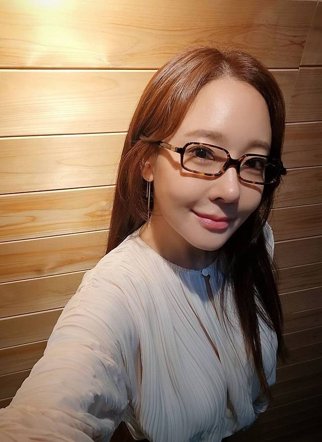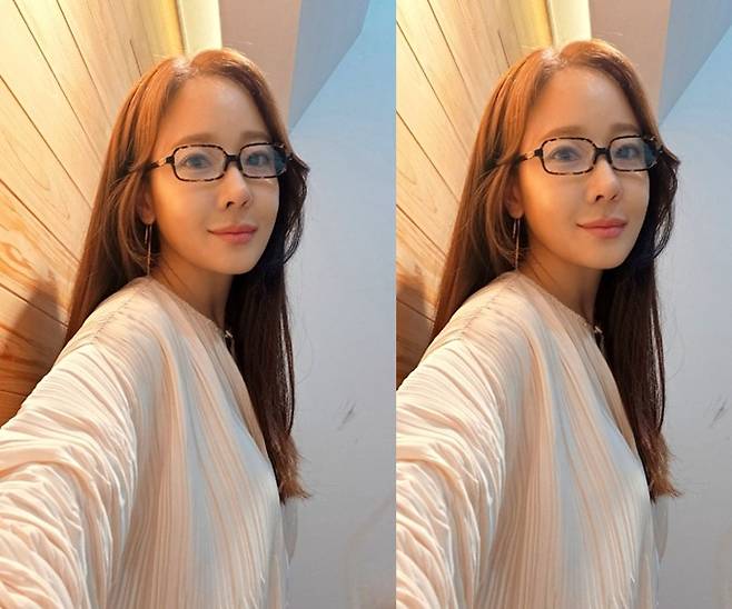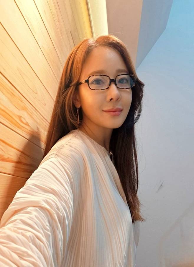 배우 소유진이 뿔테 안경에 스모크 블라우스 나들이룩으로 대학생 여친 스타일을 완성했다.