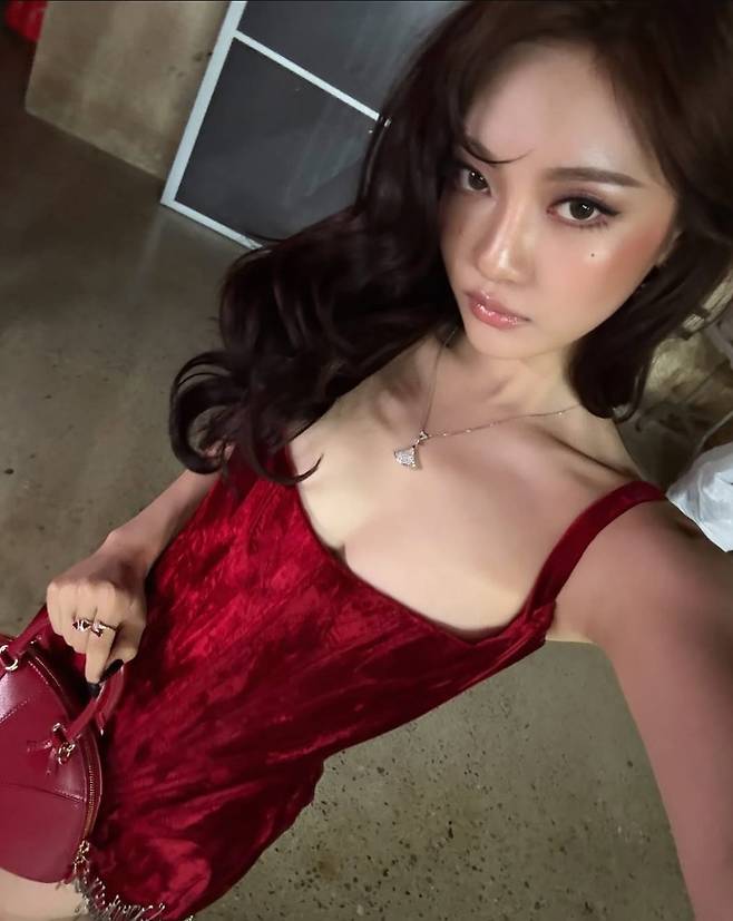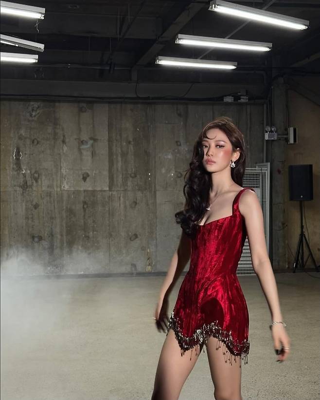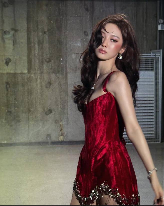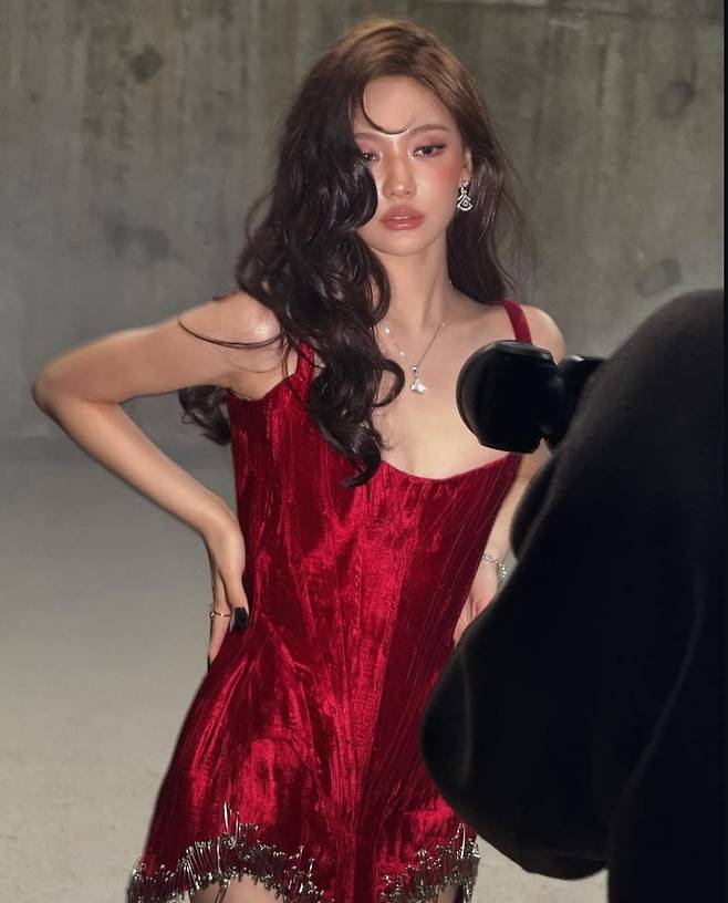 닝닝은 깊은 레드 컬러의 벨벳 미니 드레스를 완벽히 소화하며 강렬한 존재감을 드러냈습니다.