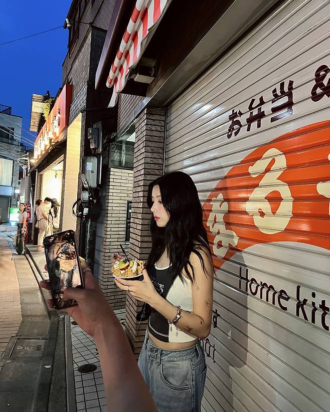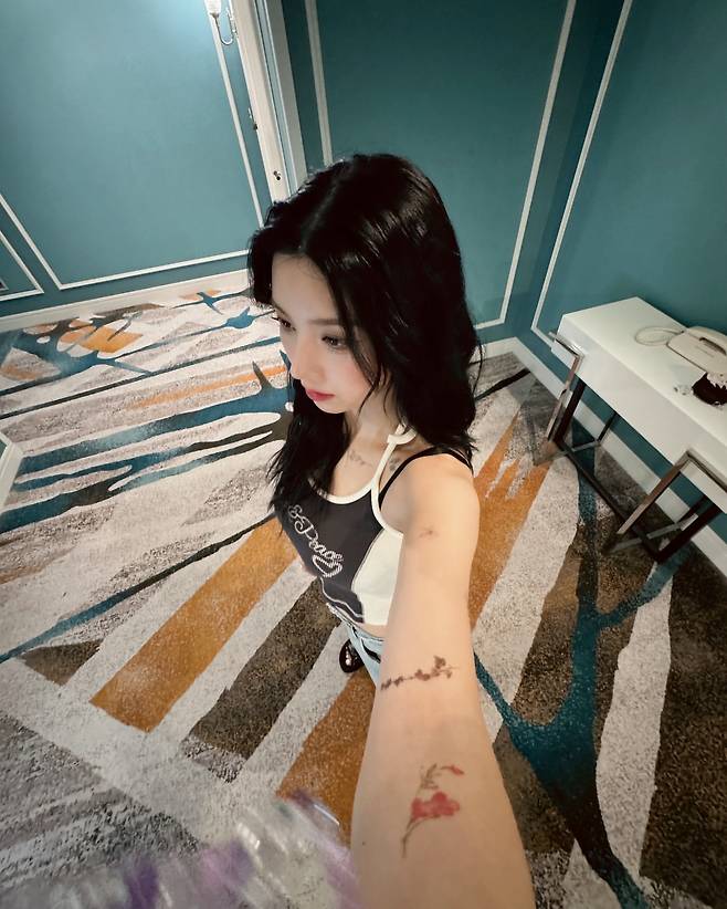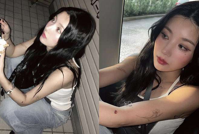 사진 속 권은비는 탱크톱에 청바지를 입고 팔에 컬러 타투를 드러내고 있습니다.
