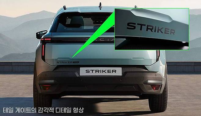 그리고 차체 다른 부분에서도 감각적 디테일이 눈에 띄는데요, 테일 게이트 아래쪽에 긴 비례의 육각형 음각 면을 양쪽에 만들어 놓았습니다. 물론 여기에는 아무 기능은 없는 걸로 보이고 단지 육각형 모양으로 음각 면이 만들어져 있고, 그 아래에 차량 명칭 ‘STRIKER’ 스티커가 붙어 있습니다.