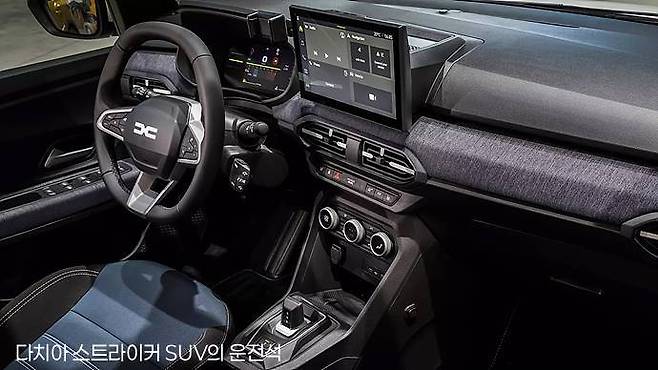 다치아 스트라이커의 운전석은 요즘의 미니멀 한 인상의 디자인을 가진 차들을 기준으로 보면 최신의 경향은 아니라는 느낌이긴 합니다. 그렇지만 운전석 클러스터에도 디스플레이 패널이 쓰였고, 센터 디스플레이 패널도 적용돼 있습니다. 그리고 물리 버튼이 꽤 많이 적용돼 있고, 전자식 기어 시프트 레버도 위치 자체는 전통적인 위치인 앞 콘솔에 만들어져 있습니다.