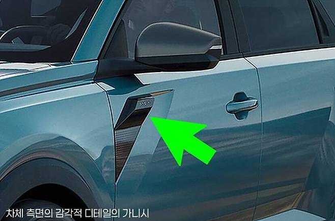 검은색의 가니시는 몸체가 약간 돌출된 걸로 봐서는 측면 카메라가 거기에 들어가 있을 걸로 보이기도 합니다만, 리어 뷰 미러가 달려 있으니, 카메라 보다는 센서일 가능성도 있습니다. 카메라 기능을 하려면 조금 더 돌출돼야 할 것 같기도 합니다. 만약 저 부분에 정말로 카메라가 들어가 있다면 매우 잘 처리된 디테일 디자인으로 보입니다.