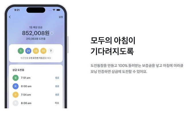 도전통장은 매일 아침 미라클 모닝을 실천하는 고객을 추첨해 상금을 지급하는 상품입니다. 개설 후 1만원 보증금을 예치하고 평일 5일간 설정한 시간에 출석한 경우 참가자들이 모은 보증금 총액에 연 2% 보너스율을 곱한 상금을 받을 기회를 제공합니다.