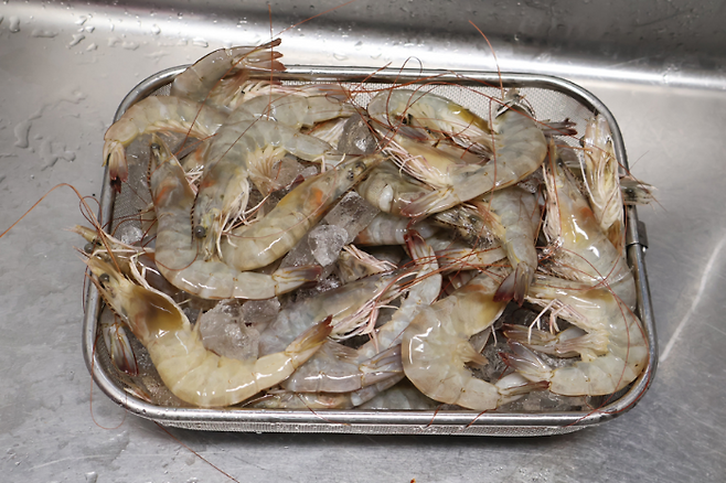 큰 얼음들은 빼내고 새우만 모아봅니다. 그냥 바로 찌면 좀 지저분해요. 새우 수염도 길고 이물질도 있으니까 손질을 좀 하고 쪄야 깔끔하답니다.