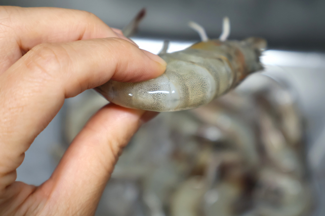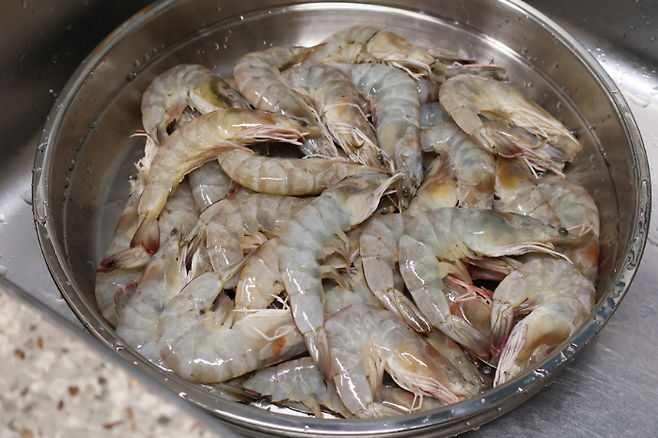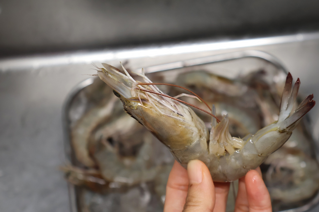 새우 등에 보면 까만색 줄이 있는데 이게 바로 새우 내장(똥) 이라고 해요. 이쑤시개를 이용해서 제거하기도 하는데 사실 우리가 먹는 흰다리새우는 양식이라 딱히 제거하지 않아도 무방합니다.