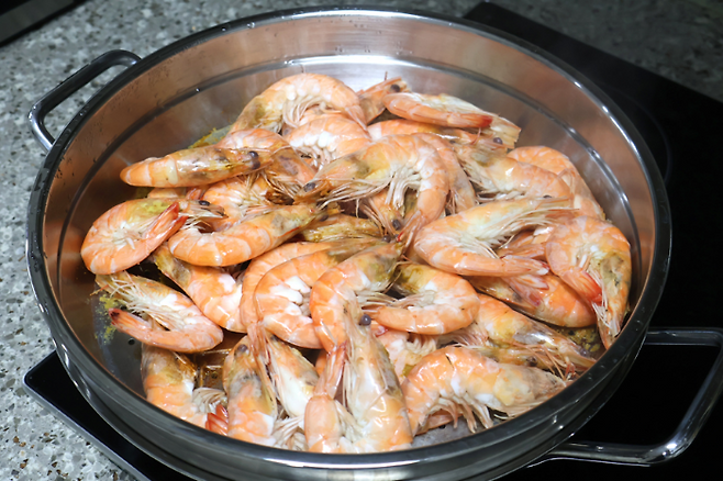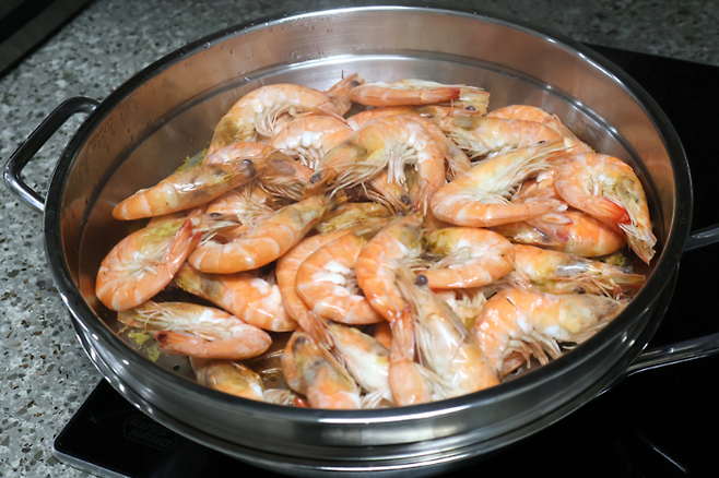 바야흐로 새우의 계절이 왔어요. 가을은 대하의 계절이라고 할 만큼 씨알 굵은 새우들을 맛 볼 수 있는데요. 진짜 대하는 가격이 비싸니까 저희집은 이 계절이 되면 흰다리새우 잔뜩 사다가 새우찜을 해먹는답니다. 집에서 소금구이 하기에는 연기도 소금도 처리하기가 번거로워 쪄서 먹곤 하는데요. 탱글한 새우찜은 맛도 있고 만들기도 간편해요.