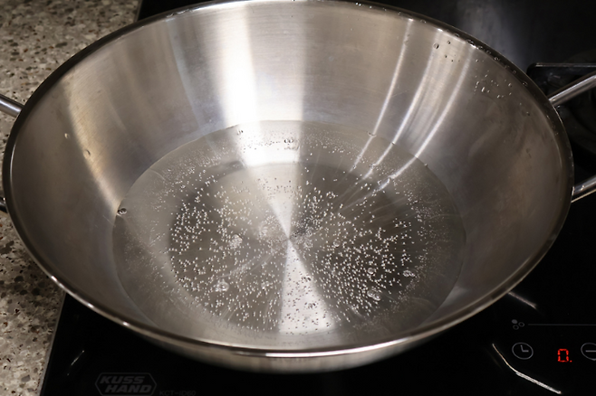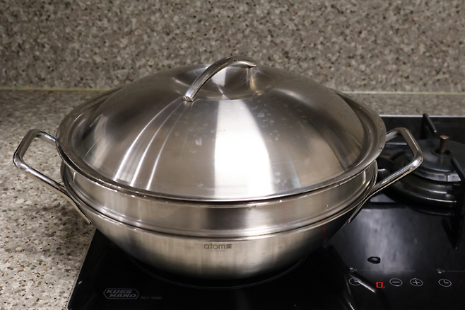찜기에 물을 넣고 팔팔 끓입니다. 이 때 물의 양은 채반을 넘지 않는 정도여야 해요. 새우에 물이 닿으면 맛이 없어요.