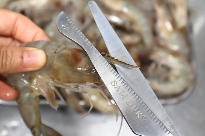 가위를 이용해서 새우뿔을 잘라줍니다. 새우 먹다가 찔렸어요 하면 거의 이 새우뿔이에요. 찔리면 많이 아프니 이왕이면 손질하는 것이 좋겠죠.