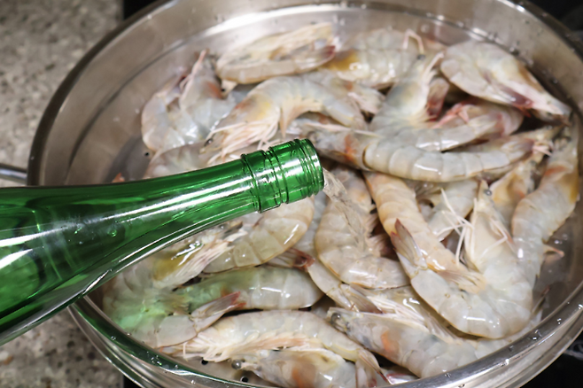 물이 팔팔 끓으면 채반 위에 새우를 올린 다음 청주, 혹은 소주를 소주잔 1컵 정도 골고루 뿌려줍니다. 청주나 소주를 넣으면 비린내를 제거할 수 있어요.