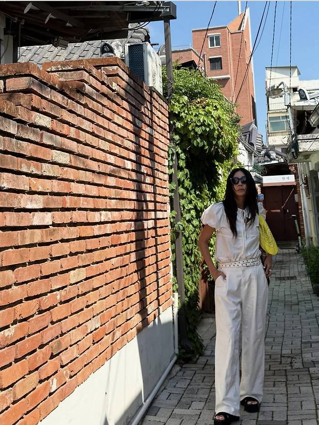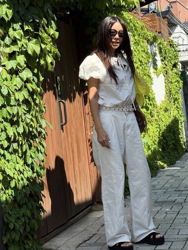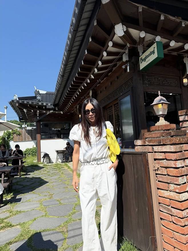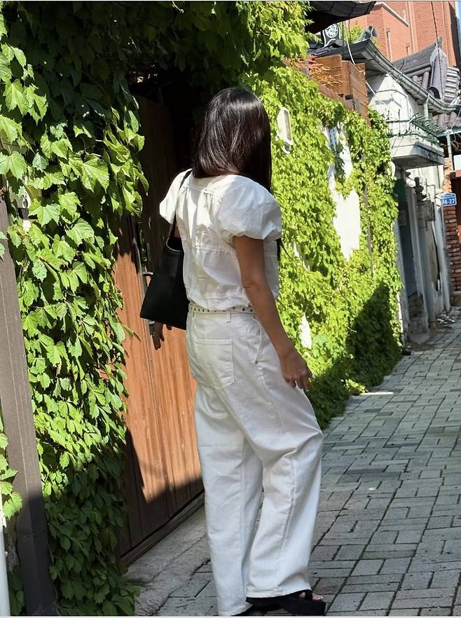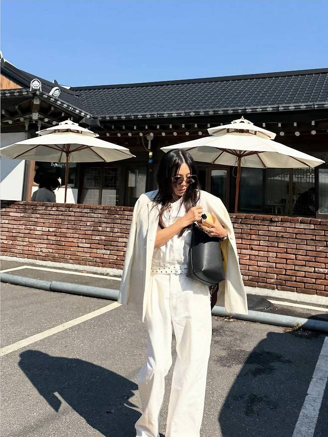 황신혜는 퍼프 소매가 인상적인 흰색 블라우스에 같은 컬러의 하이웨이스트 팬츠를 매치해 감각적인 올화이트 셋업을 선보였습니다.
