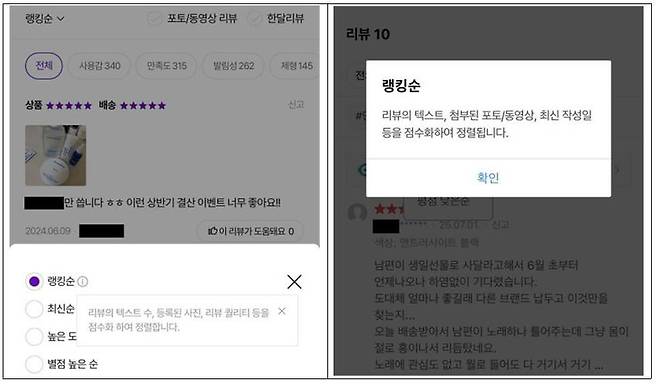 자체 알고리즘 정렬 방식은 리뷰 글자 수, 작성일, 평점(별점), 사진 포함 여부 등 온라인몰마다 기준이 달랐으나 대부분 평점이 높고 장점 위주로 묘사된 리뷰를 먼저 표시했습니다.