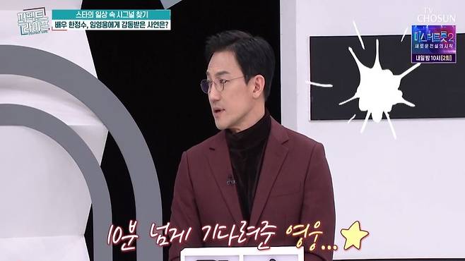 "임영웅과 액션 연기로 합을 맞췄어야 했는데 내 연습에 방해가 될까 10분 넘게 조용히 날 기다리고 있었다"는 것이 한정수의 설명.