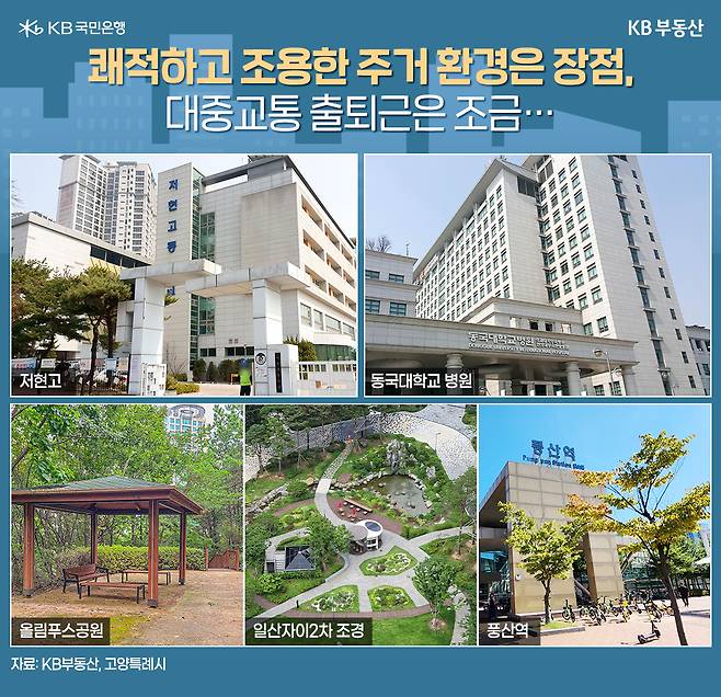 식사동 단지들은 중대형 타입이 많고, 보안 시스템이 잘 갖춰진 아파트가 많아 조용하고 프라이버시를 보장받을 수 있다는 점이 장점입니다. 또 일산, 상암동, 여의도 등 방송국이 위치한 지역으로 쉽게 이동할 수 있어 서울 출퇴근 직장인에 비해 시간이 자유로운 연예인들이 많이 거주하고 있는 것으로 알려져 있습니다. 다만 풍산역, 백마역까지 차로 15분, 대중교통으로 20~30분 소요돼 매일 대중교통으로 출퇴근해야 하는 직장인에게는 불편함이 있습니다.