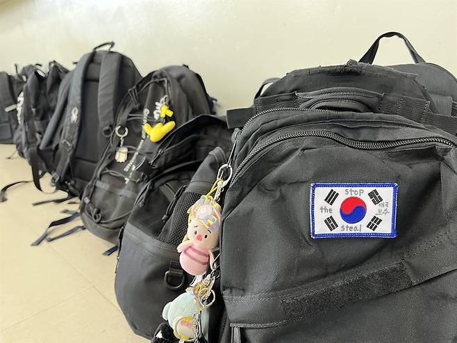 | ▲ 시험날 교실 앞으로 내놓은 한 아이의 가방에 태극기 위에 스스로 적어넣은 '애국보수'와 'STOP THE STEAL' 글귀가 선명하다. 그는 여전히 윤 대통령 탄핵은 잘못된 거라고 믿고 있다. 뒤로 세월호 노란 리본을 매단 가방도 보인다. 지금 교실엔 극우화가 가랑비에 옷 젖듯 진행 중이다. |