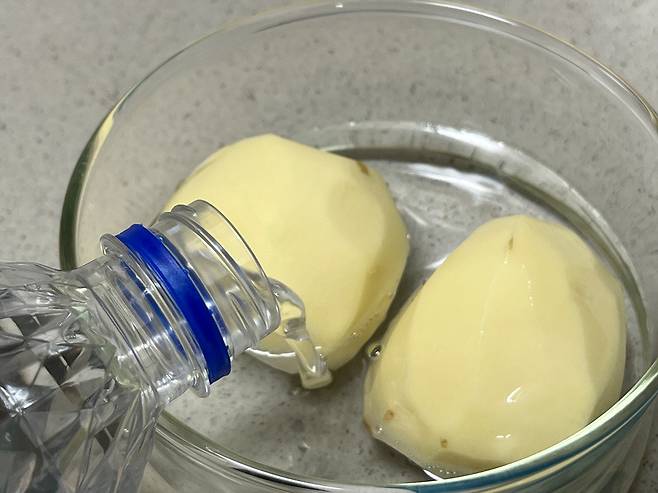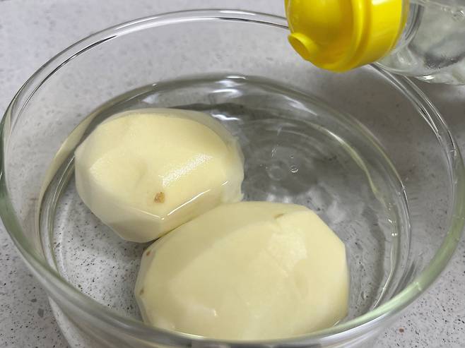 이때 식초를 2~3방울 넣으면 감자의 갈변을 방지하는 데 효과적입니다. 식초 산성 성분이 갈변을 지연시키는 역할을 합니다.