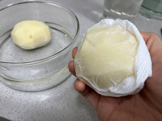 또 다른 방법은 깐 갑자를 랩에 싸서 보관하는 것인데요. 랩에 싸기 전 키친타월로 감자 표면의 수분을 최대한 제거하세요.