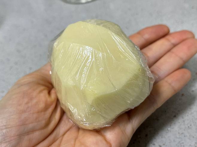 그다음 랩에 최대한 밀착시켜서 감자를 1개씩 싸줍니다. 이렇게 하면 공기 접촉을 막을 수 있어 감자의 갈변을 방지할 수 있습니다.