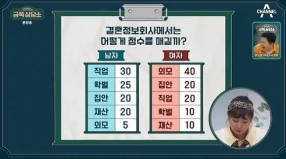 공개된 점수표 속 남녀 점수 기준은 달랐다. 남자는 100점 만점에 직업이 30점, 학벌이 25점, 집안이 20점, 재산이 20점, 외모가 5점을 차지했다. 반면 여자는 외모가 40점, 집안이 20점, 직업이 20점, 학벌이 10점, 재산이 10점이었다.