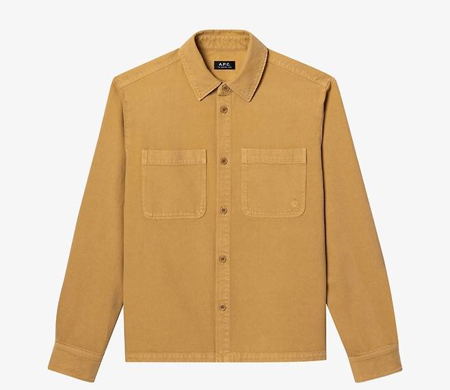 가슴 포켓 앵커 자수가 더해진 카멜 색상의 데님 오버셔츠는 아이디룩(대표 김재풍)에서 전개하는 프렌치 컨템포러리 브랜드 '아페쎄(A.P.C.) 제품으로 클래식 칼라와 인조 뿔 단추가 눈길을 끈다.
