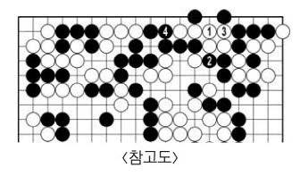 돌은 잘 잡히지 않는다는 생명력을 흑25가 보여준다. 하지만 형세와는 동떨어진 묘수였다. 1선으로 걸어간 흑돌은 이음새가 완벽하지 않았다. 백30으로 엉뚱하게 <참고도> 1에 두는 잘못을 저지르면 거꾸로 잡힌다. 어김없이 백30과 32에 맞췄다. 36에 먹여치고 38에 집어넣은 데까지 완벽했다. 이렇게 큰 패가 나서는 흑에 희망이 없다. 백이 패를 이겼고 얼마 못 가 흑이 돌을 거둬야 했다.