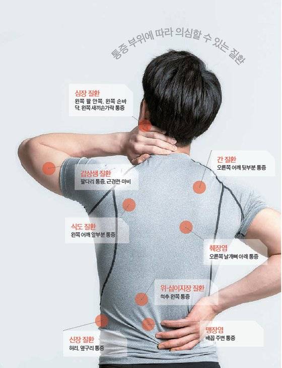 이외에도 식도에 문제가 있을 땐 왼쪽 어깨 앞부분이, 위·십이지장 염증이 생겼을 때는 명치도 아프지만 척추 왼쪽에서 먼저 통증이 나타난다. 췌장에 염증이 생겼을 땐 오른쪽 날개뼈 아래와 허리 중간 부분이 아프다. 맹장염이 생겼을 때도 맹장이 있는 복부 오른쪽 밑부분이 아닌 배꼽 주변부가 슬슬 아프다. 단순 복통으로 생각해 방치하다 복막염으로 진행돼 치료가 어려워질 수 있다.