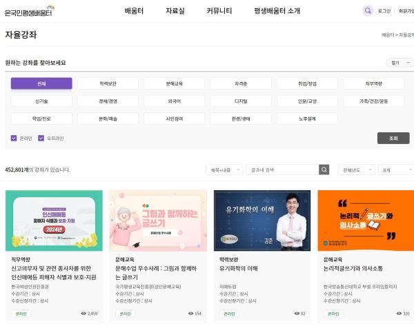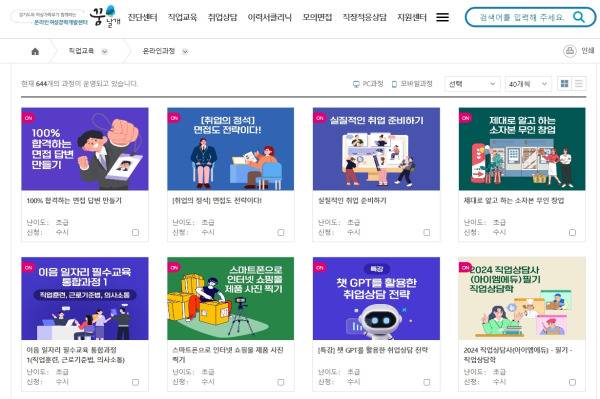 교육 과정 메뉴 접속시 취·창업에 도움이 되는 직업능력·역량 강좌부터 인문교양, 시민참여, 문해 교육 등 다양한 강좌를 무료로 수강할 수 있다. 강좌 수료시 1개월 간의 복습기간이 제공되며, 동일과정 재신청은 학습기간 종료 후 가능하다.