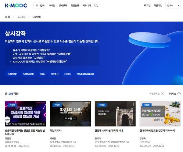 강의는 신산업 분야 단기직무능력인증과정인 ‘매치업’, 상시 학습 및 이수증 발급이 가능한 ‘상시강좌’, 강좌 이수시 학점을 인정 받을 수 있는 ‘학점은행과정’ 등으로 구분된다. 인문, 사회, 교육, 공학, 자연, 의약약등 분야별 강좌를 제공한다.
