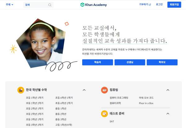 칸 아카데미 한국 사이트도 마련돼 있다. 한국 초·중·고 수학 과정부터 컴퓨터 프로그래밍, 미국 학년별 수학 강좌도 볼 수 있다.