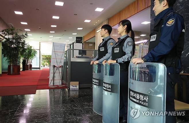 (서울=연합뉴스) 최재구 기자 = 헌법재판소의 윤석열 대통령 탄핵 심판 선고가 예정된 4일 경계가 강화된 서울 종로구 정부서울청사 출입구에서 청원경찰대가 만일의 사태에 대비하고 있다. 2025.4.4