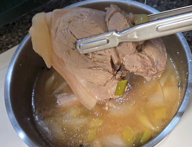 시간이 지나면 완성된 수육을 꺼내 먹기 좋은 크기로 썰어내면 됩니다.