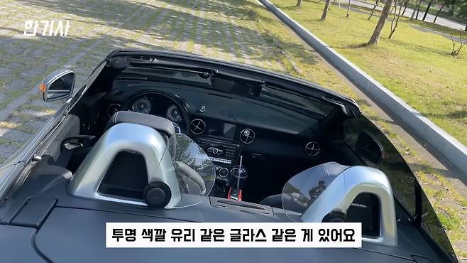 그리고 차의 뚜껑을 열었을 때 투명 색깔 유리 같은 글라스 같은 게 있는데, 이것은 오픈 헤어링을 할 때 뒤에서 들어오는 바람을 막아주는 역할입니다.