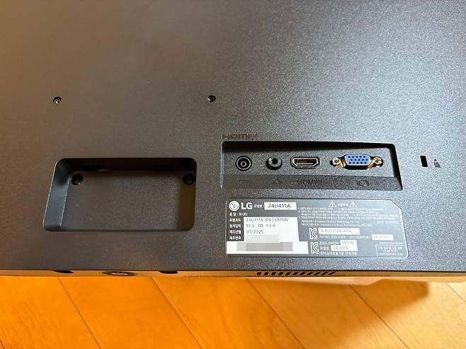 후면 패널 사진입니다. 역시 가성비 제품이다 보니 많은 단자는 없습니다. 전원과 이어폰, HDMI, RGB단자가 전부입니다. 이 정도면 기본이라 뭐라 할 수는 없지만 DP 단자가 있었다면 더할 나위 없었을 텐데 아쉽습니다. 그리고 이 제품은 내장 스피커가 없습니다. 저는 오히려 좋습니다. 컴퓨터와 연결하면 간혹 일순위로 모니터 스피커를 선점하기 때문에 불편할 때가 있거든요. 우수한 품질의 스피커가 아니라면 모니터 스피커는 없는 것이 좋은 것 같습니다.