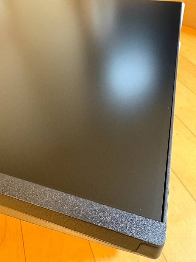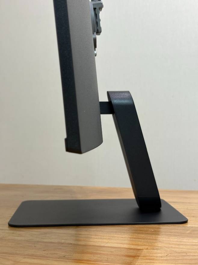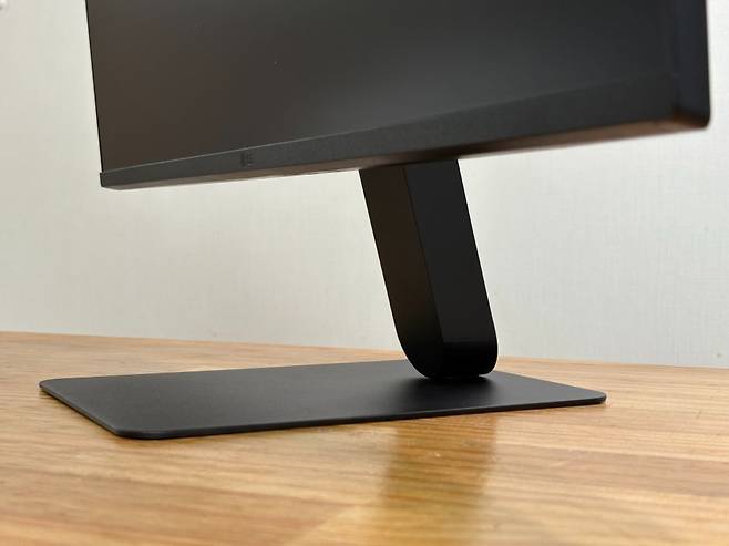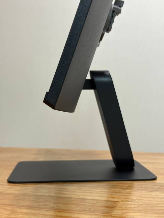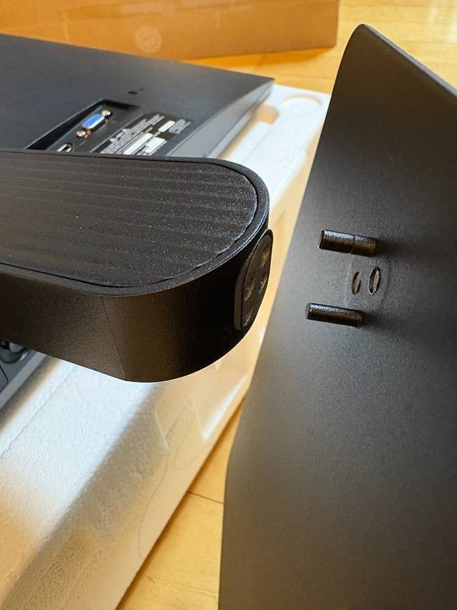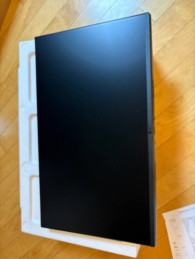 모니터 설치를 마쳤습니다. 제품 소개 사진에서 보는 것처럼 접착제로 붙여 놓은 듯한 스탠드의 모양새가 특이하며, 착시를 일으킵니다. 스탠드는 상하로 틸트는 되지만 좌우나 높이 조절은 안됩니다. 특히 높이 조절이 안되는 것이 아쉽습니다. 스탠드 자체가 높은 디자인이 아니라서 바닥에 두면 모니터 위치가 눈높이와 너무 낮습니다. 목이 아래로 향하게 만드네요. 별도의 모니터 받침대를 준비하거나 모니터암을 사용해야 합니다.
